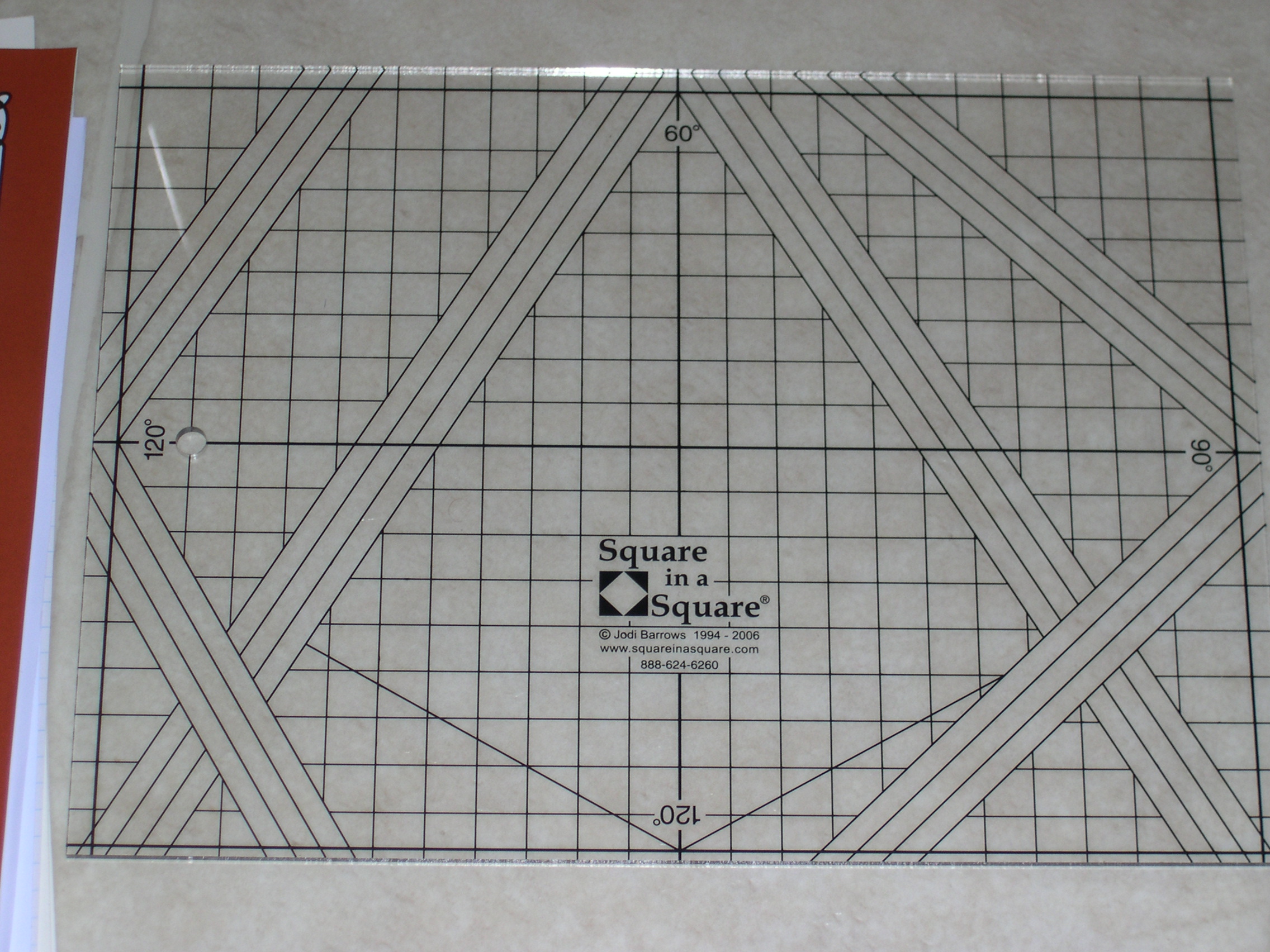 In the Square in a Square class, we learned how to use this cool ruler which allows you to make perfect points on your quilt blocks. You sew fabric strips to fabric squares, and then use the lines on the ruler to trim up the center square to give you a perfect square in a square. The instructor was excellent at demonstrating how to make perfect squares, triangles and diamonds with strip piecing and rotary cutting with this ruler.
